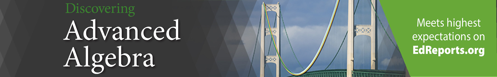 Discovering Advanced Algebra uses data to model pure-algebra concepts, derive functions, solve problems, and build skills, giving students daily experience with modeling, problem solving, and the use of mathematical tools. Investigations, visual representations, and opportunities for discussion enable teachers to integrate multiple teaching modes so visual, auditory, and kinesthetic learners all benefit.